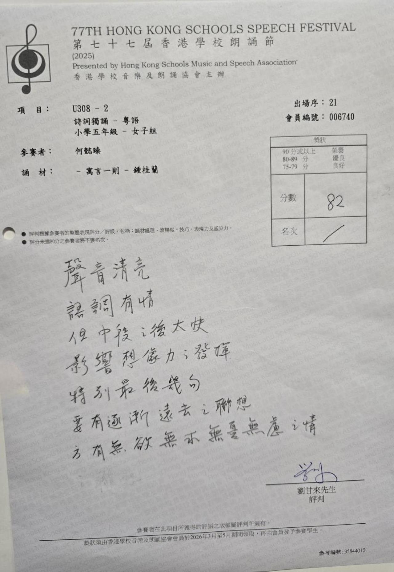 比賽名稱:第七十七屆香港學校朗誦節