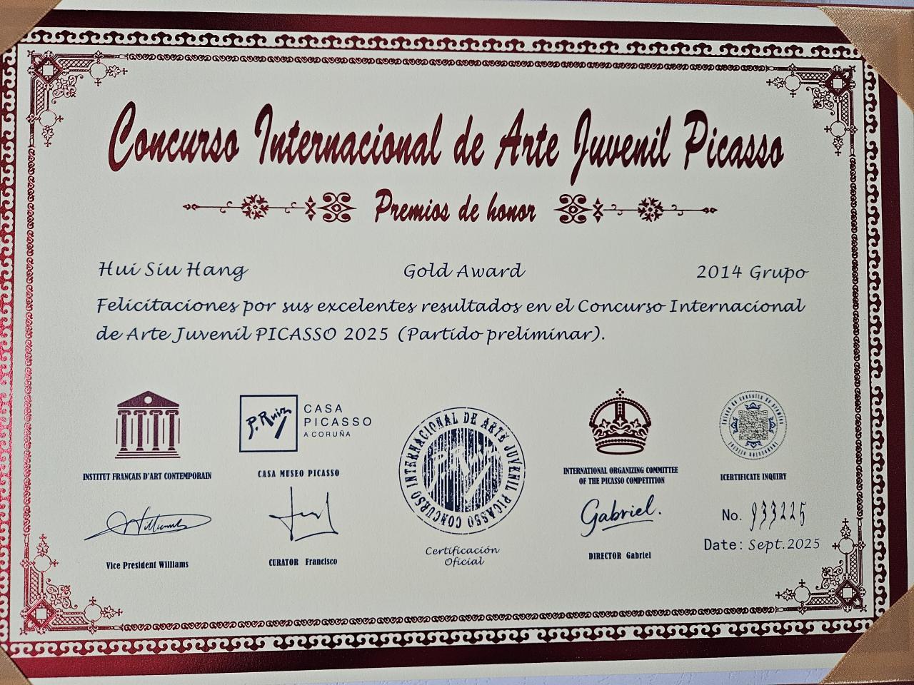 2025-11-08 班別:6B 姓名:HUI Siu Hang比賽主辦機構:International Gifted Education &Art Association比賽名稱:Concurso International de Art Juvenil Picasso 2025獲得獎項:Gold Award 視藝