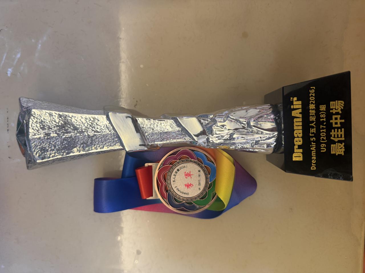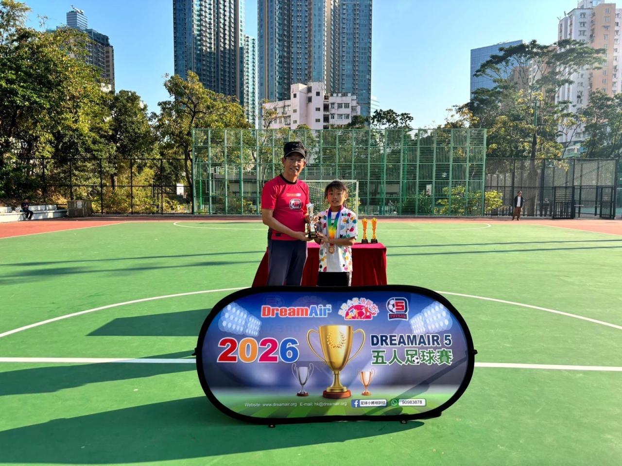 2026-01-26 班別:4D 姓名:張千穎比賽主辦機構:DreamAir International Company比賽名稱:DreamAir 5「五人足球賽2026」獲得獎項:U9組季軍及最佳中場 體育