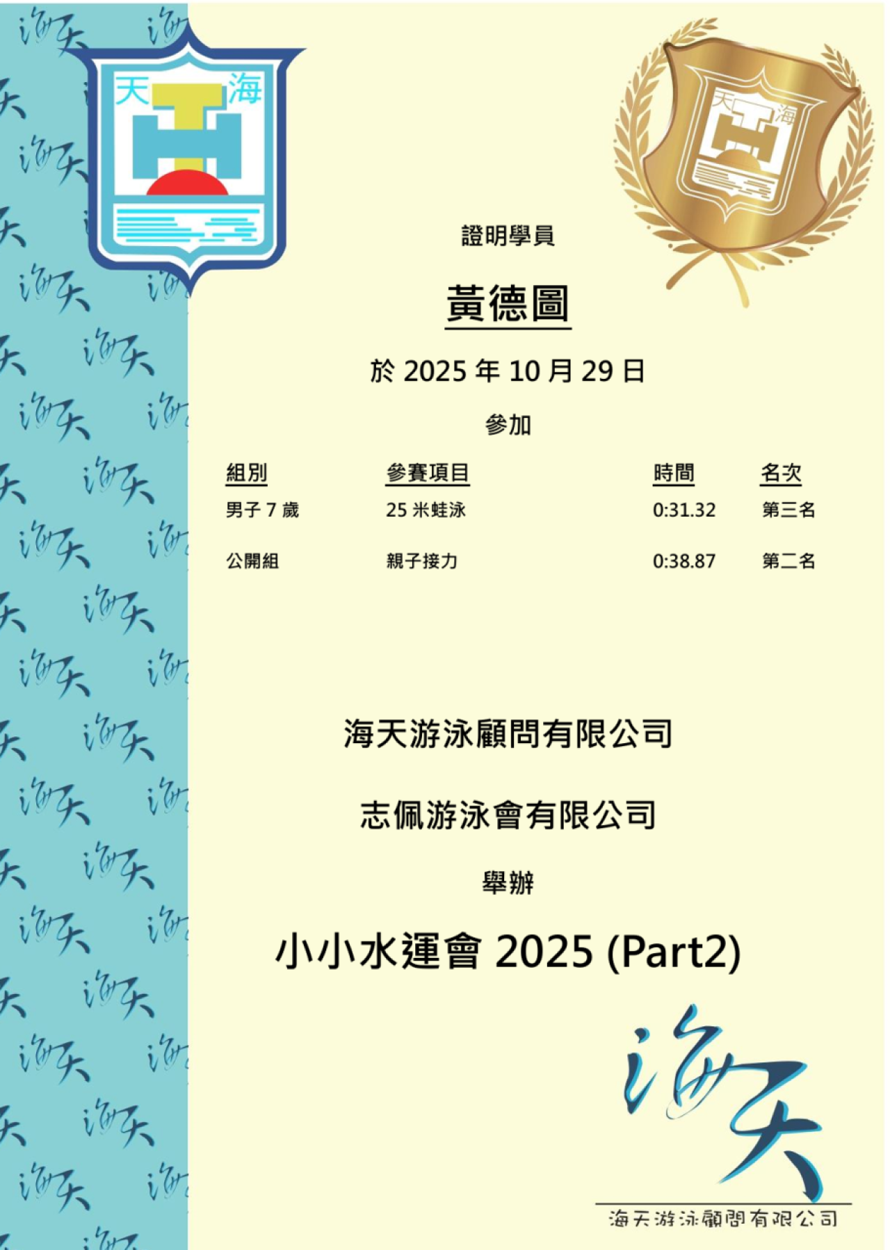 獲得獎項:男子7歲 25 蛀泳 - 季軍 公開組 親子接力 - 亞軍